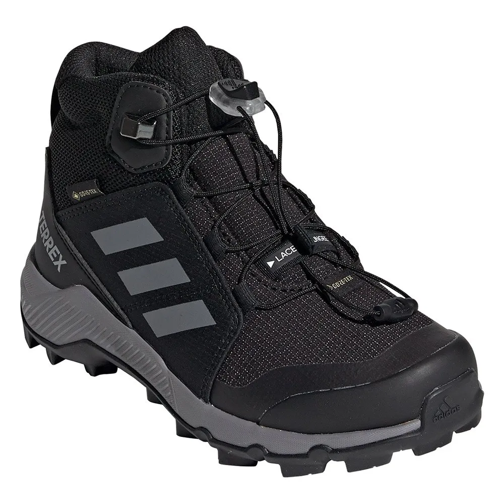 L’empeigne du Terrex Mid GTX Kid est faite d’un tissu ripstop très résistant et respirant avec des renforts TPU ajoutés pour une durabilité et un soutien total. La fermeture à lacet habituelle a été jetée pour un lacet élastique pour faciliter les choses aux utilisateurs mineurs, tandis que des éléments réfléchissants ont été placés le long du châssis pour améliorer la visibilité dans des situations de faible luminosité ou d’urgence.