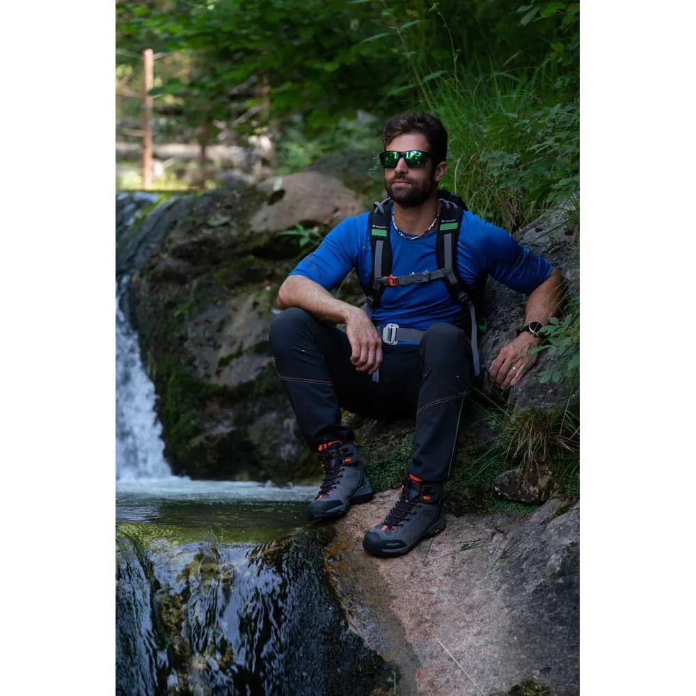 La tige souple en daim et tissu imperméables offre un ajustement confortable et ajusté, tandis que la doublure en mesh respirant assure un confort climatique optimal pour votre pied. Pour assurer une protection de premier ordre contre les éléments, nous avons développé la technologie Trezeta Water Stopper, une membrane qui empêche l’eau de pénétrer dans la chaussure. La pointe est dotée d’une technologie de caoutchouc pulvérisé qui est surmoulée directement sur la tige pour offrir une protection exceptionnelle à vos orteils. Les pieds restent au sec et entièrement protégés : la semelle intercalaire en EVA à double densité offre un amorti lors de la frappe du pied pour réduire les impacts, minimiser les vibrations et offrir une démarche plus douce. La semelle Vibram® Inverness présente une large surface d’appui pour une stabilité maximale, avec des crampons largement espacés et autonettoyants. La semelle présente une bordure surélevée pour assurer une excellente protection du pied sur les terrains difficiles.