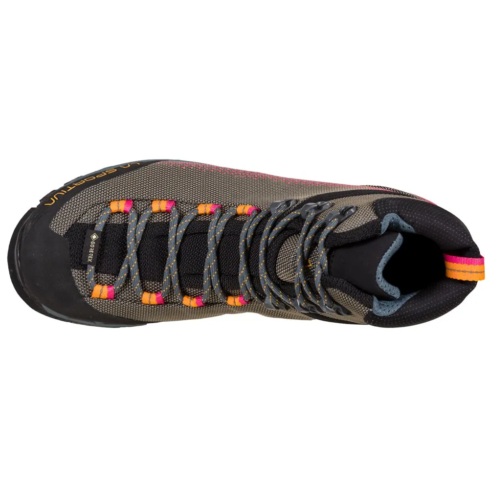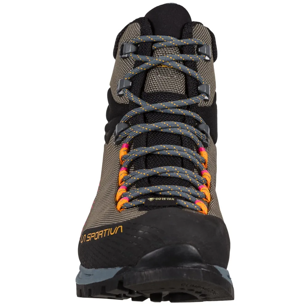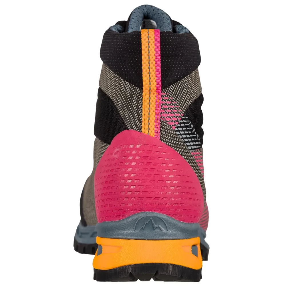 Botte de randonnĂ©e et de randonnĂ©e au look fĂ©minin et Ă la technologie dĂ©rivĂ©e de la famille Trango. FabriquĂ© Ă partir de composants recyclĂ©s (lacets et semelle OrtholiteÂź Hybrid) et sans utilisation de matĂ©riaux d’origine animale, il est conçu pour les sentiers hors route, les promenades en forĂȘt et les randonnĂ©es avec un sac complet. La tige est hydrofuge et rĂ©sistante Ă l’abrasion, avec un collier de protection Comfort qui empĂȘche les pierres ou la boue de pĂ©nĂ©trer. La prĂ©sence de la membrane GORE-TEX Performance Comfort garantit respirabilitĂ© et impermĂ©abilitĂ©, l’articulation 3D Flex appliquĂ©e Ă la cheville apporte un soutien et permet un contrĂŽle maximal lorsque vous vous penchez sur un terrain accidentĂ©. La semelle VibramÂź avec Climbing Zone Ă la pointe permet une utilisation sur les voies de ferrata. Look Trango, semelle VibramÂź et technologie La Sportiva pour le confort, la protection et la sĂ©curitĂ© en montagne.