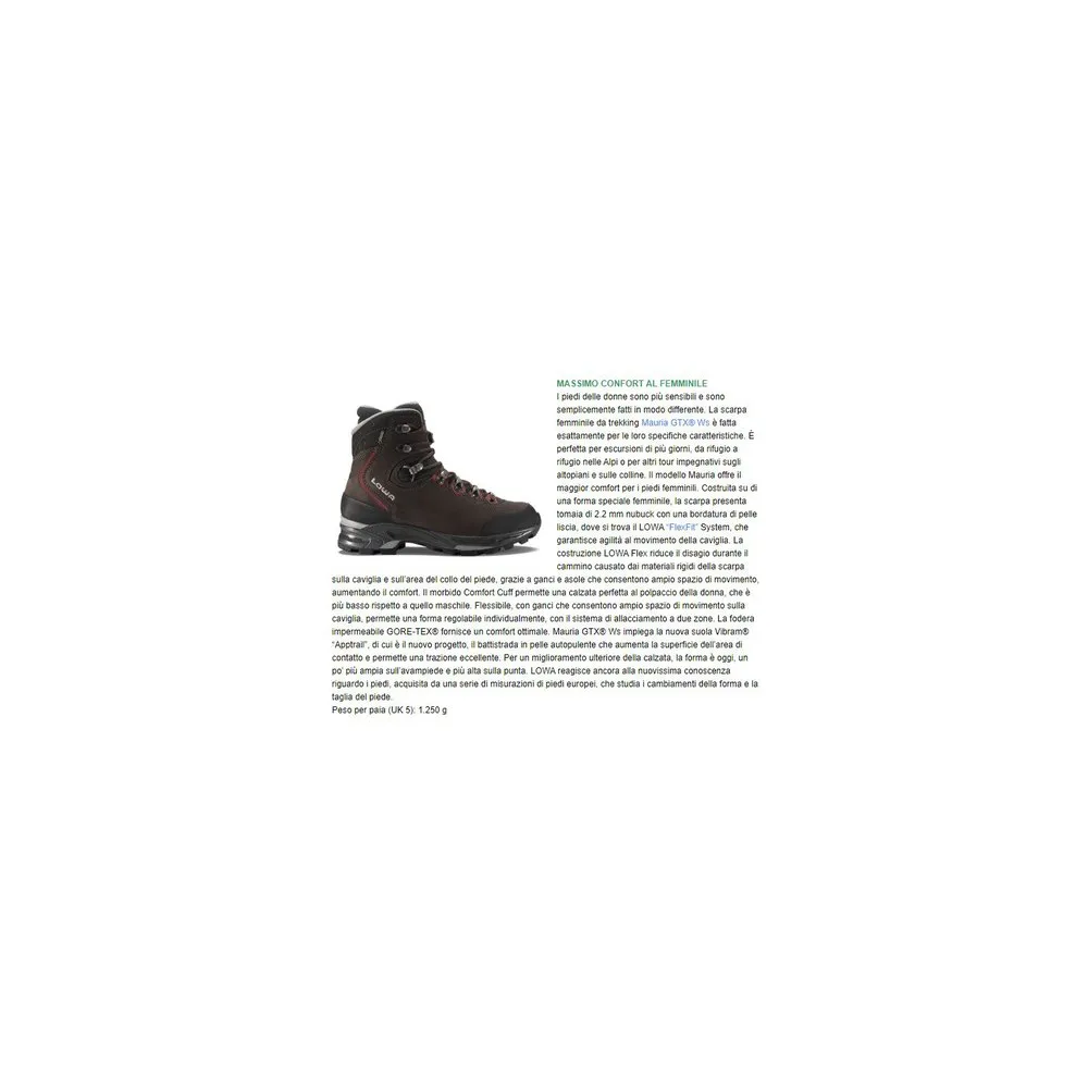 Tutti in montagna, ma senza compromessi in materia di comfort! Il modello MAURIA GTX Ws rimane al tuo fianco persino durante i tour piĂč difficili. Lo scarpone da montagna in pregiaÂtissimo nabuk Ăš stato sviluppato appositamente per le donne e se la cava benissimo in tante situazioni diverse. Il suo punto di forza? LâesÂtremitĂ speciale del collo rende molto conforÂtevole la calzatura, che Ăš stata studiata in maniera specifica per lâanatomia del piede femminile. Inoltre, LOWA ha integrato nella scarpa una fodera in GORE-TEX per tenere testa a vento e intemperie.